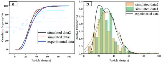 Comparison of cumulative frequency and relative frequency of experimental and simulated particle sizes: (a) Cumulative frequency. (b) Relative frequency.