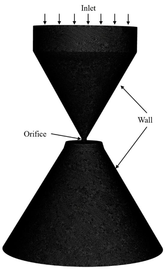 As mentioned before, the DEM model requires tremendous computation effort in a realistic scale. Therefore, we construct a three-dimensional simplified Hall flowmeter model based on the improved Beverloo’s law and partition the grid as shown in Figure 16. The orifice diameter is rescaled to one-tenth of the original Hall flowmeter orifice diameter, and all other dimensions are proportionally reduced. The simulated dimensions of the Hall flowmeter turn out to be 0.25 mm for the orifice diameter and 6 mm for the height of the upper barrel, and the half-tilt angle of the upper cone remains at 30°. An amount of 0.55 g of powder is poured into the hopper region and then flows under gravity through the funnel orifice.