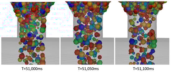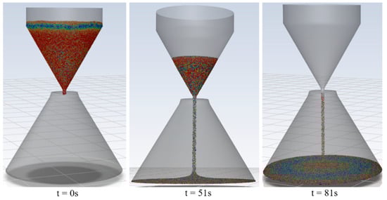 In the DEM simulation, all the powders flow out from the Hall flowmeter in 81 s, and the initial, intermediate, and final stages of the powder flow are shown in Figure 18. The orifice of the Hall flowmeter is zoomed in on to visualize the particle flow process, as shown in Figure 19.