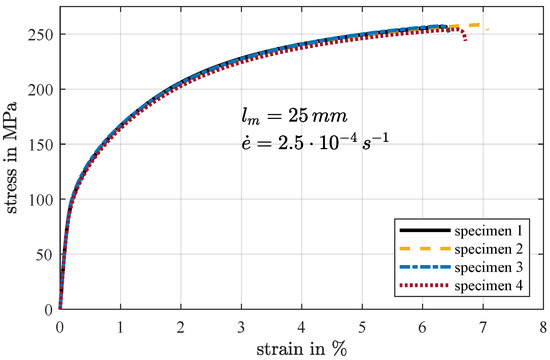 The tensile tests were strain controlled with a constant strain rate of s−1 until fracture. Strain measurements were obtained using an extensometer with a gauge length of 25 mm. Seven specimens were tested with only four failing within the measuring length. These four tests are depicted in Figure 3.