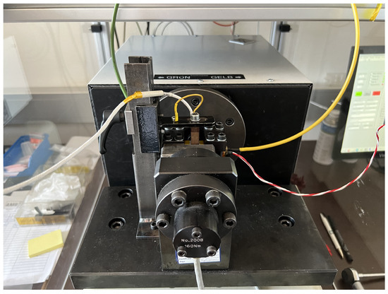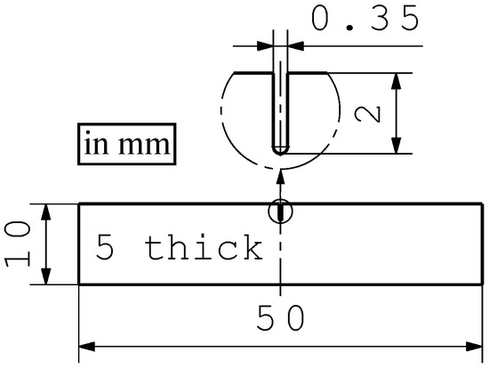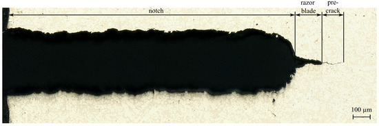 The notch of the SENB specimens (Figure 4) was sharpened using a razor blade and abrasive diamond paste. Additionally, the specimens were compression pre-cracked at a stress ratio of . This methodology ensures that the pre-crack is fully open at the beginning of the fatigue crack growth measurements, so that crack closure effects at the beginning of the test can be neglected [26,27]. The pre-cracks had a length in the range of 100 . That specimen preparation with an initial crack can be seen in Figure 8.