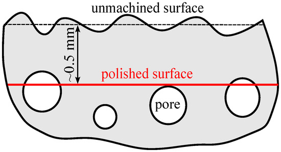 In a previous study, it was discovered that pores become exposed during surface removal. Figure 6 schematically depicts that process. Furthermore, it was found that the surface condition has no significant impact on the fatigue strength of the investigated material. This holds true not only for the tests conducted in air but also for the corrosion fatigue tests performed in a 5% NaCl solution [25].