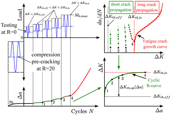 Once the loading is increased to a level that induces stress intensity values surpassing the long crack threshold, crack growth becomes continuous. The load level is then maintained constant until the specimen fractures, causing the stress intensity to increase solely due to the growing crack length. The fatigue crack growth curve for long cracks can be measured, as depicted in Figure 9 (top right). A common model to assess the crack growth rate for a given stress intensity is the Paris–Erdogan model [28] expressed in Equation (2). In this equation, the parameters C and m describe the height and the slope of the approximated straight in the so-called Paris region.