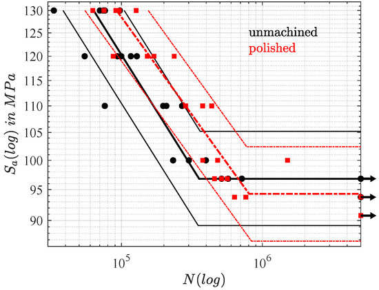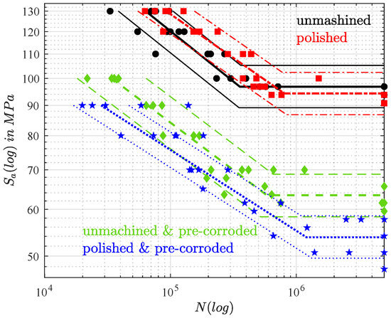 Figure 16 compares all the S-N curves and reveals the significant reduction in fatigue strength due to pre-corrosion damage. While the surface condition has only a minor influence on the fatigue strength of the uncorroded state [25], this changes significantly with the applied corrosive damage. The fatigue strength of the polished and corroded specimens is significantly lower than that of the unmachined and corroded specimens.