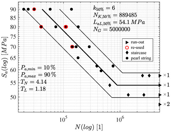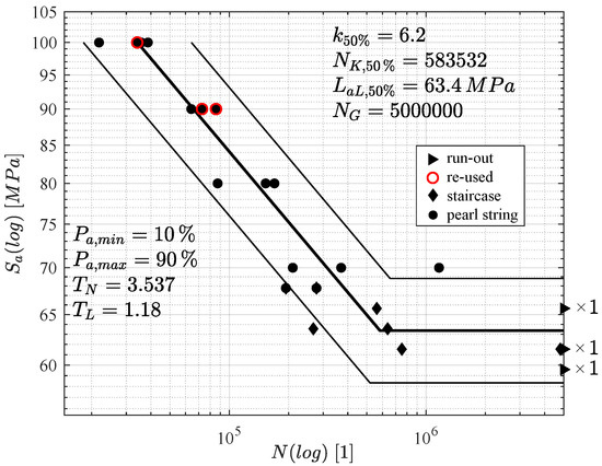 Consistent with previous investigations (see Table 3), all fatigue tests are evaluated according to the standard DIN 50100 [30]. The staircase method is applied for determining the long-life fatigue strength, and the pearl string method is used for the finite life regime. Run-outs, specimens that did not fail within 5,000,000 load cycles, are subjected to significantly higher load levels and tested again. The scatter range in the long-life regime has a major uncertainty due to the relatively small number of samples tested; therefore, a constant value () suggested by the standard is used for presenting the results.