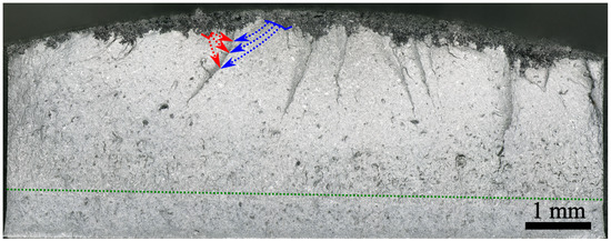 The initial pre-corrosion damage is clearly distinguishable by the dark coloration of the affected areas. That corrosion damage of the unmachined specimens manifests as homogeneously spread corrosion occurring localized at the eutectic phase. The localized corrosive attack, which covers the whole specimen surface, is detailed in Figure 13. It is evident that cracks propagate from various corrosive defects across different crack planes; two advancing crack fronts are marked within Figure 12 (red and blue arrows). Areas where these planes converge at different heights appear as darker lines due to shadowing. The area of fatigue crack propagation appears smoother, and the residual fracture is marked by a green dashed line.