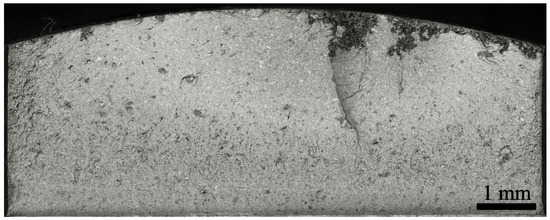 The fatigue strength is even more reduced due to the corrosive attack. Again, a knee-point is clearly visible, and the scatter, especially in the long-life regime, appears to be increased. While some specimens exhibit a similar corrosive attack, others in that series show a more inhomogeneous distribution of corrosion. A representative polished and pre-corroded specimen with an inhomogeneous distribution failed at 61.5 MPa after 752,100 load cycles, and the corresponding fracture surface is depicted in Figure 15.
