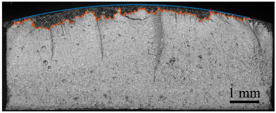 The high contrast between the corroded material and the base material in the images of the fractured surfaces (see Figure 12 and Figure 15) allows for a detailed analysis of the statistical distribution of the corrosion depth using a digital image processing routine. The edge of the specimen surface and the boundary between the initial corrosion damage and the base material were detected. The perpendicular distance from the surface to this boundary was defined and measured as the corrosion depth. The measurement is performed individually with a spacing of one horizontal pixel for all the images. Figure 17 shows a representative fracture surface with the detected edge of the specimen (blue) and the corrosion boundary (orange).