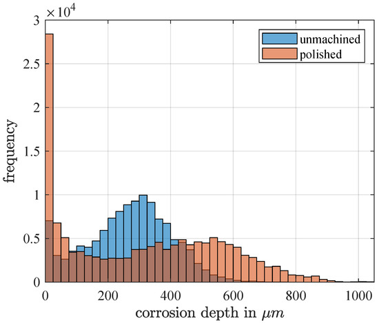 This evaluation was performed for all specimens, and the results are depicted in Figure 18, which compares the corrosion depths for the different surface conditions. The blue histogram represents the unmachined specimens and is displayed in the background, while the orange histogram for the polished specimens is shown transparently in the foreground. The frequency denotes the total number of measured points between the corresponding corrosion depth boundaries.