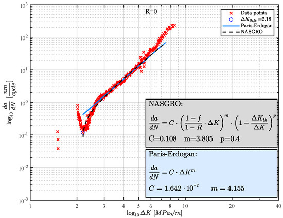 Four crack propagation tests at a stress ratio of were used to evaluate the Paris and NASGRO parameters (see Equations (2) and (3)). Additionally, one test at a stress ratio of was conducted to determine the effective threshold value. Figure 19 presents a representative test along with the evaluated model parameters.
