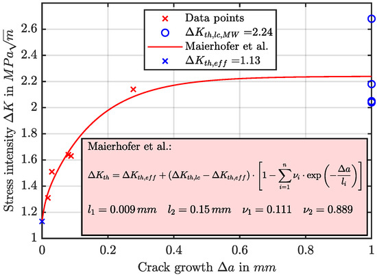 For load amplitudes smaller than the effective threshold (), no crack growth occurs. For amplitudes between the effective and the long crack threshold (), the crack propagates but stops due to the build-up of crack closure effects. This build-up of the threshold value depending on the crack length can be visualized using a cyclic R-curve, as depicted in Figure 9 (bottom right). The mathematical description of the threshold build-up is provided in Equation (1), where the parameters and are fitting parameters, and is the difference between the initial crack length (after pre-cracking) and the actual crack length [27]. We used four parameters for the description of the R-curve; therefore, .