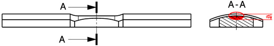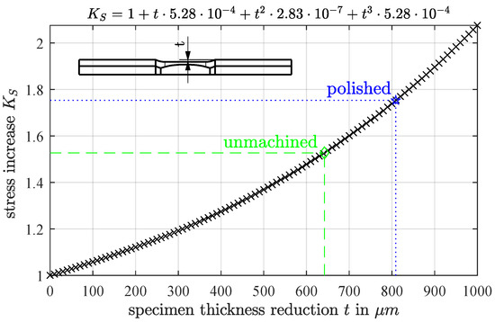 The first approach was stress-based. The corrosive attack, especially for the unmachined specimens, appeared relatively homogeneous. On the basis of the observations of Bauer-Troßmann et al. [5] for localized corrosion with homogeneous lateral and depth distribution, the specimen thickness was reduced to simulate the corrosive attack. In the FEM model, the thickness of the specimen was reduced in the critical, highly stressed area while keeping the thickness at the clamping sites constant. This thickness transition was carefully designed to avoid influencing the stress distribution within the highly stressed areas.