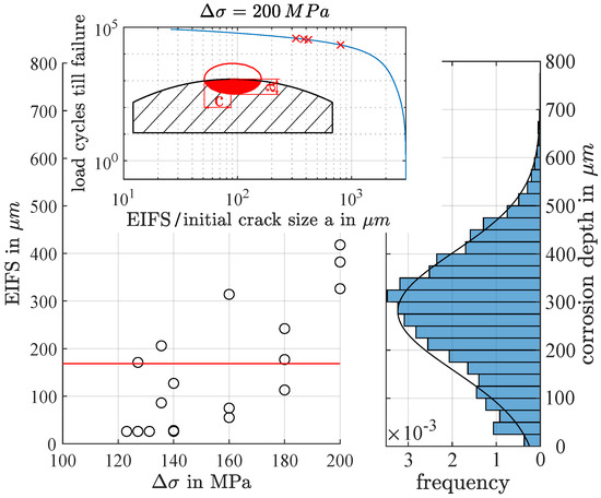 Figure 22 depicts the EIFS calculation and compares the results with the statistical distribution of the corrosion defects. Defect sizes below the the intrinsic defect size are excluded from the displayed corrosion depth distribution. The intrinsic defect size was calculated numerically based on the short crack threshold and the long-life fatigue strength , according to Equation (10). The crack size was incremented by steps of 1 to account for the influence of crack size on the geometry factor. For the long-life fatigue strength , the value for the unmachined specimens was used, as it is slightly higher than that of the polished specimens (see Table 3). However, the difference in using the long-life fatigue strength of the polished specimens is marginal and would only change the intrinsic defect size by 1 .