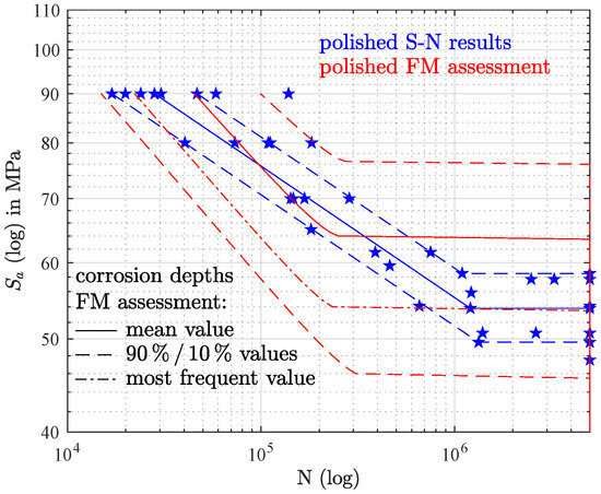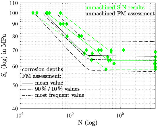The thickness was reduced for different percentiles of the corrosion depth distribution (see Table 5). Additionally, the initial elliptical crack was set at the intrinsic defect size . The crack length versus load cycles was calculated iteratively, starting from the initial crack to a 3 mm long crack (which marks the specimen’s failure) for different load levels. By combining the load levels and the number of load cycles until fracture, fracture–mechanical assessed S-N curves were calculated. Figure 24 compares the evaluated S-N results to the assessed S-N curves based on the fracture mechanical approach for the unmachined specimens, while Figure 25 presents the same comparison for the polished specimens.