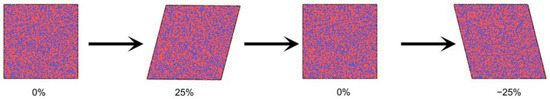 Subsequent MD simulations were carried out at 300 K. The simulations consisted of three sequential stages, as depicted in Figure 1, considering Lees–Edwards boundary conditions [38] in a triclinic simulation box, with initial tilts set to zero. In the first stage, pure shear was applied to the simulation box in the positive x-direction, relative to the z-direction, deforming it at a rate of ~108/s until a shear strain εxz = 25% was reached. Then, with the same deformation rate, the strain was reversed, and the simulation box was brought back to its original shape. Finally, in the last stage, also at a deformation rate of ~108/s, the system continued to be sheared in the negative x-direction, ending with a strain εxz = −25%.