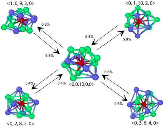 In Figure 2, we present a statistical picture of the most frequent transformations involving the Cu-centered icosahedra during the MD simulation of the metallic glass at rest. Considering that Cu atoms made up 2/3 of the alloy’s composition, one should expect the transformations undergone by the predominant Cu-centered polyhedra, particularly the icosahedra, to have a greater impact on the properties of the Cu66Zr34 amorphous alloy. Figure 2 should be interpreted as follows. In the center, the icosahedral LAE represents either the starting or ending point, depending on the direction of the arrows. If an arrow points from the icosahedral LAE to another LAE, it indicates that at time t, the copper atom had an icosahedral environment, and at time t + Δt, where Δt = 20 ps, it transitioned to a different LAE. Conversely, if an arrow points from another LAE to the icosahedral LAE, it means that the copper atom initially was enclosed within that atomic environment at time t, and at time t + Δt, it underwent a transformation into an icosahedral atomic environment. The numbers accompanying the arrows indicate, on average, how many times these transformations between the icosahedral and other LAEs occurred within the 20 ps interval between consecutive snapshots in the MD simulation.