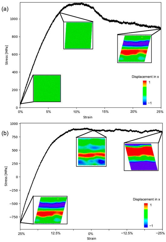 The onset of yielding originated from the formation of an increasing number of LPD and LND atom clusters, the majority of which (>80%) were Cu atoms. The maximum stress of |σxz| = 1.2 GPa occurred at a strain of ~12%, after which these clusters gradually coalesced, leading to the emergence of three distinct regions within the simulation box for strains larger than ~15%. The first region was a band-like region where most atoms exhibited LPD, i.e., they were displaced in the direction of the applied shear. There was a second band-like region where the majority of nonaffine atomic displacements occurred in the opposite direction and were larger than 0.1 nm. Both regions can be clearly visualized in Figure 3a, when the strain reached 25%, as two parallel blocks. The third region was found separating the previous two, and it was characterized by random nonaffine atomic displacements in either direction. Band formation was associated with softening, and, by the end of the first step, at 25% strain, the absolute stress had decreased to approximately 0.9 GPa. Additionally, around 34% of the atoms had nonaffine displacements greater than 0.1 nm in either the positive or negative x-direction compared to their positions in the initial BMG state at rest.