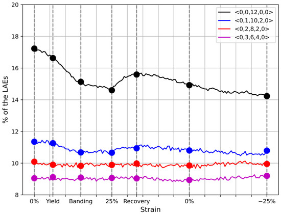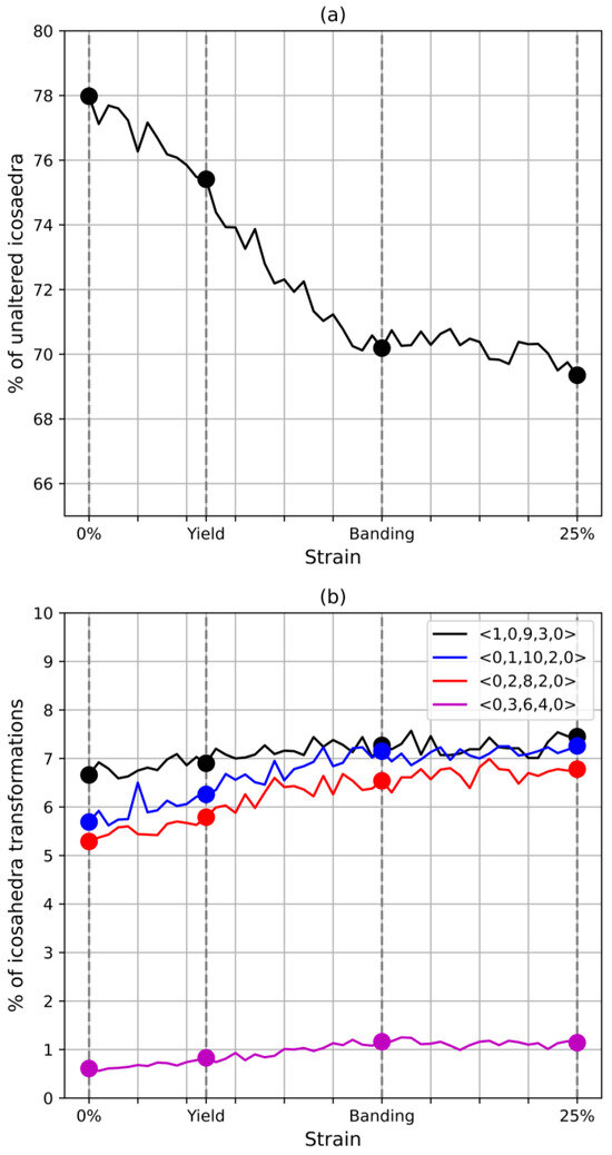 An effect of shear manifested in the destabilization of the Cu-centered icosahedral atomic environments. In Figure 4a, it can be seen that even before yielding, the percentage of icosahedra that remained unchanged between consecutive snapshots of the MD simulation showed a consistent, albeit slight, decline, from nearly 78% to approximately 75.5%. Once the metallic glass began to yield, this percentage of unchanged icosahedra decreased to just above 70% when the strain reached ~15%. At this level of strain, where banding started to form, the decline in the percentage of unchanged icosahedra between consecutive MD snapshots started to slow down. As can be seen in Figure 4b, this trend can be directly associated with the transformations of the <0,0,12,0,0> polyhedra into the preferred LAEs, which remained the same as the BMG at rest. Shear deformation promoted an increase in the frequency of transformations from icosahedral polyhedra to <0,1,10,2,0> and <0,2,8,2,0> polyhedra, rising from 5.8% to approximately 7% and from 5.6% to around 6.5%, respectively. Transformations to <1,0,9,3,0> polyhedra, which were the most common in the BMG at rest, showed a slight increase, from just below to slightly above 7%. Finally, the frequency of transitions from icosahedra to <0,3,6,4,0> LAEs, which was about 0.6% in the metallic glass’s resting state, reached more than 1% by the end of the first stage of shear deformation. The effect of shear was more pronounced in the initial phase of deformation, still within the elastic regime and shortly after the onset of plastic flow, before band formation. Banding can be linked to the deceleration in the increase in transition frequencies for the <0,1,10,2,0>, <0,2,8,2,0>, and <0,3,6,4,0> polyhedra, which displayed a tendency to saturate in the second half of the first shear step.