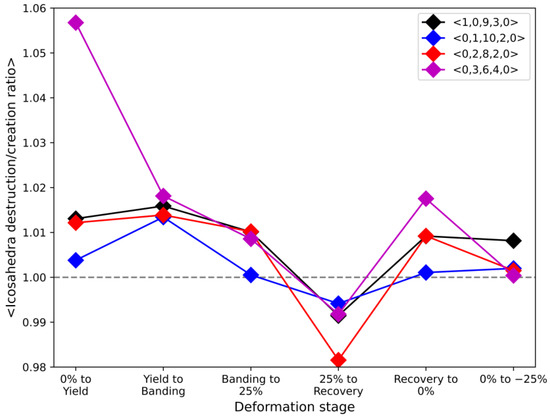 Average icosahedra destruction-to-creation ratios between consecutive MD snapshots at different deformation stages of the BMG. The horizontal dashed line represents the point at which the number of forward and reverse transitions involving the icosahedra is equal.