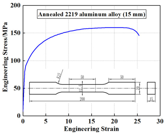 Annealed 2219 aluminum alloy sheet with a thickness of 15 mm was selected for this experiment. The uniaxial tensile tests were conducted in accordance with ASTM E8/E8M-21 [22]. The tensile specimens with dimensions of 50 mm gauge length and 12.5 mm gauge width were cut from the initial sheet by wire-electrode cutting, and the tensile direction was parallel to the rolling direction. The initial strain rate was 1.0 × 10−3 s−1. The engineering stress–strain curve obtained by uniaxial tensile tests is shown in Figure 1, and the basic mechanical properties of the material are shown in Table 1.