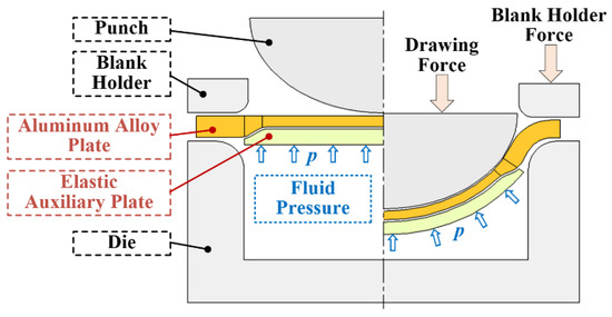 Different from the traditional tailor-weld blanks and tailor-rolled blanks [10,11,12], the thickness transition zone of the differential thickness plate used in this work is annular, and the plate is in a complex stress state of deep drawing deformation. Due to the thickness difference in different zones of this kind of plate, stress concentration is more likely to occur in the thin zone during the deformation process, which can result in poor deformation uniformity, excessive local thinning, and a great risk of rupture. To address the forming difficulties of plates with such structural characteristics, hydroforming was adopted—combined with an elastic auxiliary plate set on the lower surface of the aluminum alloy plate—to increase the forming limit of the plate with differential thickness. Hydroforming is an advanced sheet forming process, which is suitable for thin-walled curved components with poor plasticity and complex structures [13,14]. It can effectively increase the forming limit of the sheet [15,16] and improve the forming accuracy and deformation uniformity of components [17,18]. As a highly elastic material, polyurethane can play a good auxiliary role in plastic deformation, such as a flexible soft die in a multi-point sandwich forming process, a support mandrel in tube deformation, or a self-sealing role in hydroforming [19,20,21].