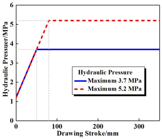 In this work, conventional deep drawing (CDD) and hydroforming experiments were conducted, and two different hydraulic loading paths were designed with the maximum hydraulic pressures of 3.7 MPa and 5.2 MPa. The hydraulic loading paths are shown in Figure 4. The total drawing stroke was 350 mm.