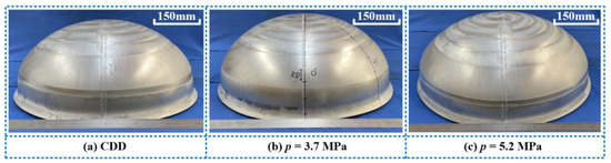 The deep drawing experiments were carried out in accordance with the above experimental procedures. The ellipsoid shells with differential thickness obtained via hydroforming under different hydraulic pressures are presented in Figure 5. The drawing depth of the ellipsoid shells is 350 mm, and the height of the outer edge thick zone in the vertical direction exceeded the design requirement of 45 mm.