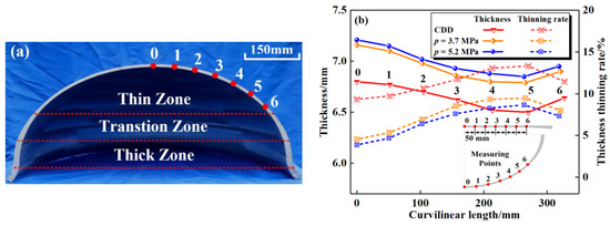 The obtained ellipsoid shells were cut in half, and the thickness at each measuring point was measured via a vernier caliper with an accuracy of 0.02 mm. Figure 6a demonstrates the section diagram of the drawn ellipsoid shell with differential thickness, clearly revealing the thin zone, thickness transition zone, and thick zone from interior to exterior. The thickness thinning rate is a critical parameter to evaluate the quality of this kind of thin-walled component. The measuring points were drawn every 50 mm in the radial direction on the differential thickness plate prior to deformation in order to obtain the thickness distribution within the thin zone, and the measuring points were 0 to 6 in order from the center to the outside. The thicknesses and thickness thinning rates at each measuring point are shown in Table 2.