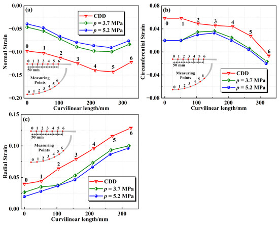 Point 0 in Figure 6a is the center of the blank and the drawn part, and the radius of point 0 is always 0. Thus, the circumferential strain at this point cannot be obtained by measuring the variation in the radius. In the process of deep drawing, crack and wrinkle defects usually occur in the unsupported zone [24,25], and the requirement for strain accuracy at the pole (point 0) is relatively low. Since the strain components at point 0 and point 1 are relatively close, the circumferential strain at point 0 and point 1 are roughly considered to be equal, thereby completing the strain−length curve. The calculation results of strain components at each measuring point via the above equations are given in Table 3. The calculated strain components within the thin zone of the drawn ellipsoid shells under different hydraulic pressures are presented in Figure 7.