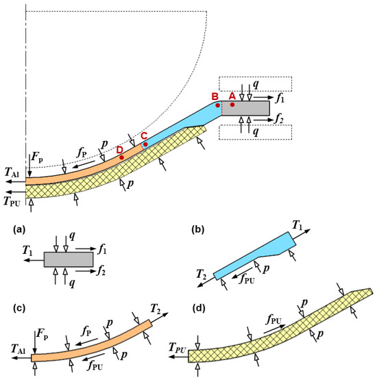 where μPU denotes the Coulomb friction coefficient between the aluminum plate and polyurethane plate, and p represents the hydraulic pressure. Thus, the force balance along the generatrix can be written as follows: