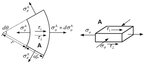 By substituting the radius of point B (rB) into Equations (9) and (10), the stress components at point B can be written as follows: