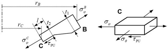 where l represents the generatrix length of the thin zone within the unsupported zone, and rB and rC indicate the radii of points B and C. Thus, the radial stress at point C is shown as below: