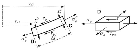 It can be known from Equation (19) that the difference in radial stress between points D and C is influenced by several parameters, including geometric parameters, hydraulic pressure, and friction coefficients. The element between points C and D experiences interfacial shear stress on its upper and lower surfaces exerted by the punch and the polyurethane plate, respectively, and the directions of both are opposite to the radial stress direction at point C. For hydroforming, the hydraulic pressure p is greater than 0. Consequently, the radial stress at point D is lower than that at point C, and the difference between the two increases with an increase in arc length ∆l, hydraulic pressure p, and friction coefficients μP and μPU. In accordance with the Tresca yield criterion, the radial stress at point D is less than the yield stress during hydroforming, implying that point D no longer meets the yield condition and is in an elastic state [32].