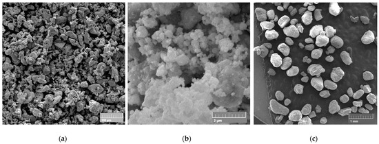 Figure 1. SEM images of the starting powders: (a) CP-Ti at 500×, (b) Ti-13Ta-6Sn at 30,000×, and (c) KCl particles at 500×.
