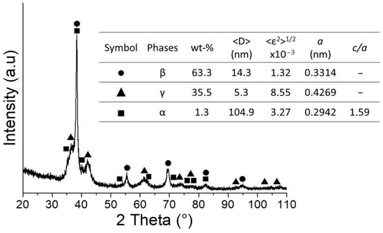 Figure 2 shows the X-ray diffraction analysis of the as-milled Ti-13Ta-6Sn powder and phase quantification obtained by the Rietveld refinement method. The figure merit values (goodness of fit (Gof)) and weighted profile R-factor (Rwp) of the refinement were 1.5 and 11%, respectively. The presence of the α-Ti phase (hexagonal close-packed crystal structure), the β-Ti phase (body-centered cubic crystal structure), and the γ-Ti phase (face-centered cubic crystal structure) was confirmed. The presence of these phases indicates that deformation-induced transformations occur during mechanical alloying (MA) [43,44,45,46]. According to Pio et al. and Aguilar et al. [28,47], the formation of β-Ti and γ-Ti phases in the Ti13Ta6Sn alloy is due to the phase transformations of α-Ti → β-Ti and α-Ti → γ-Ti, respectively, with a Burger-type [48] and Shoji-Nishiyama-type [49] orientation relationship (OR). In addition, according to the results of Pio et al. [28], the presence of a β-Ti phase was observed in the range of 60 wt. % for times between 5 and 20 h. This is consistent with the phase quantification results obtained using the Rietveld refinement method. However, the γ-Ti phase had the highest values of r.m.s. microstrain values (<ε2>1/2) with the smallest average crystallite size (<D>). This is in accordance with the main conditions for the formation of the metastable γ-Ti phase, which are (i) nanocrystalline grain sizes between 7 and 35 nm and (ii) a high density of crystal defects [42,50]. Therefore, after 20 h of AM, the Ti13Ta6Sn alloy presents a high content of the β-Ti phase, and the conditions for the formation of the γ-Ti phase are promoted.