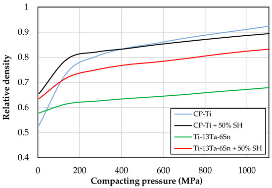 Powder compressibility analysis is important for evaluating the porous architecture of foams because of the extremely cold-worked characteristics of mechanically alloyed powders. Figure 3 shows the compressibility test results for the powders used in this study. There are two main effects on the compressibility of powders: particle rearrangement and plastic deformation. In the particle rearrangement stage, a greater increase in density was observed for the Ti powders. Compressibility analysis showed different behaviors of the alloy powder compared to that of CP-Ti. Fine-grained powders are more difficult to compact owing to their greater total surface area, which increases the friction between the particles and matrix walls during rearrangement and absorbs energy from pressure [51,52]. In addition, the powder produced via mechanical alloying offers much greater resistance to the plastic deformation stage because of the high density of dislocations resulting from the production of the alloy [42]. However, the addition of KCl particles substantially increases the compressibility of the Ti-13Ta-6Sn alloy. This can be explained by the introduction of a larger particle size distribution from the space holder, as well as a significant reduction in the total powder area, as the KCl added exhibited diameter sizes between 180 and 600 µm. This behavior was not observed for the CP-Ti + KCl blend. Irregular CP-Ti powder with an average particle size of 35 µm was easily deformed under the compaction pressure used in this analysis. The small decrease in the final relative density with the addition of the space holder can be attributed to the high hardness of KCl, which reduces the final stage of compressibility in the plastic deformation of the blend.