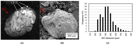 Figure 4. KCl particles mixed with (a) CP and (b) Ti-13Ta-6Sn powders, and (c) KCl size and distribution analysis by laser diffraction.