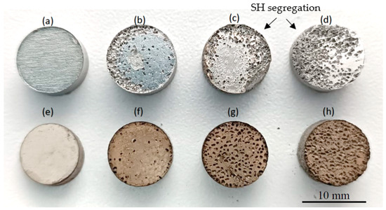 Figure 6. Plasma-assisted sintered samples of CP-Ti (a) dense, (b) 50% SH, (c) 70% SH, and (d) 80% SH and Ti-13Ta-6Sn (e) dense, (f) 50% SH, (g) 70% SH, and (h) 80% SH. Images were obtained using a digital camera.