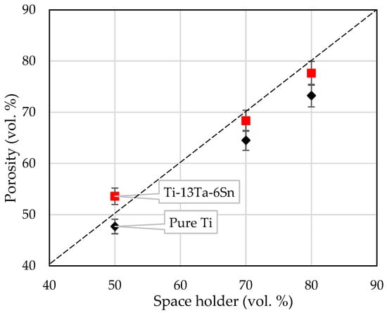 Figure 9 illustrates the influence of the space holder volume fraction on the resulting porosity. First, a direct correlation between the porosity volume fraction and the space holder volume becomes evident. Notably, the Ti-13Ta-6Sn sample with a 50% space holder content displayed a higher volumetric porosity fraction (above the standard deviation limit) than the initially added KCl volume fraction. This phenomenon could arise from the relatively low compressibility of the alloyed powder, which had the highest volume fraction in the mixture, leading to reduced densification during compaction, as shown in Figure 4. Regarding the CP-Ti samples, the porosity volume fractions exhibited values slightly lower than the added space holder volume. This may be due to the increasing shrinkage of the samples due to sintering, which demonstrates a proportional behavior with the space holder volume fraction, as shown in Table 3. This shrinkage effect may also explain why a porosity of 80% by volume fraction was not reached. Compacted samples tend to shrink during sintering, which occurs with a greater magnitude for foams with higher porosity because diffusion is enhanced. Compared with CP-Ti, the Ti-13Ta-6Sn foams exhibited a slightly higher porosity. This could be the result of two opposing behaviors that act simultaneously. While shrinkage reduces porosity, the reduced compressibility (see Figure 3) of the alloy powder increases the residual and final porosities. This porosity volume fraction increase can be observed in the dense alloy sample, which showed 5% more porosity than dense CP-Ti, which is approximately the same as the discrepancy observed for the CP-Ti and alloy samples with 50% SH (47.7% and 53.6%, respectively).