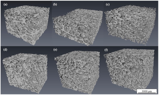 Figure 10. Reconstructed 3D images of (a) CP-Ti 50%, (b) CP-Ti 70%, (c) CP-Ti 80%, (d) Ti-13Ta-6Sn 50%, (e) Ti-13Ta-6Sn 70%, and (f) Ti-13Ta-6Sn 80% obtained using X-ray microcomputed tomography.