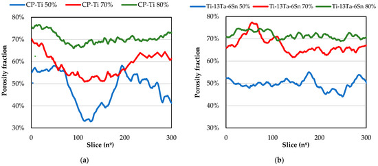 Figure 11. Pore volume fraction per slice of (a) CP-Ti and (b) Ti-13Ta-6Sn alloys.