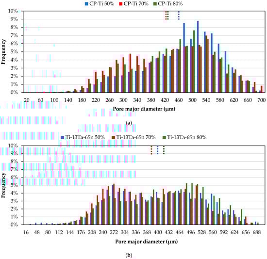 Figure 12a,b show the pore size distributions of the CP-Ti and Ti-13Ta-6Sn samples, respectively. The dashed lines at the top indicate the average pore size for each SH volume fraction. The pore distributions of both materials exhibited values in the same range as the KCl particle size distribution, as shown in Figure 4. The CP-Ti 50% sample exhibited an average pore size of 465 µm (11 µm smaller than the average KCl major diameter), showing an increasing pore-size frequency curve with a peak of 9% at 520 µm. In contrast, the CP-Ti 70% sample exhibited an average pore size of 434 µm and a more similar pore size distribution to the KCl distribution, with a peak of 4.6% between 300 and 320 µm and another peak of 7% at 540 µm. Finally, the CP-Ti 80% sample showed an average pore size of 432 µm with a wave distribution with a small peak of 3.5% at 280 µm and a high peak of 7.6% at 500 µm. The analysis showed that, when the volume fraction of SH was increased from 50% to 70 and 80%, the average pore size was reduced by approximately 30 µm.