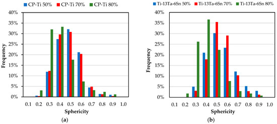 Figure 13. Sphericity distributions of (a) CP-Ti and (b) Ti-13Ta-6Sn alloys.