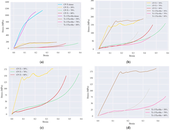 Figure 14. Measured engineering stress–strain curves obtained by compressive tests of (a) all samples, (b) all foams, (c) CP-Ti foams, and (d) Ti-13Ta-6Sn foams.
