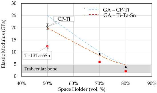 All the foams exhibited a dramatic decrease in the elastic modulus with an increase in the SH volume fraction. The addition of 50 and 70 SH vol.% reduced the elastic modulus to values within the range of 5–30 GPa, (20.48 and 9.15 GPa for CP-Ti and 12.23 and 5.95 GPa for the alloy, respectively), which is equivalent to that exhibited by the cortical bone structure range. Considering that the elastic modulus of cortical bones is different in the longitudinal and transverse directions because of anisotropy, typical elastic moduli were reported as their average values. Moreover, the CP-Ti and Ti-13Ta-6Sn samples with 80 vol. % exhibited elastic moduli of 3.7 and 2.0 GPa, respectively, exhibiting great potential for replacing the trabecular bone structure, which exhibits an elastic modulus within the range of 0.76 to 4 GPa [3].