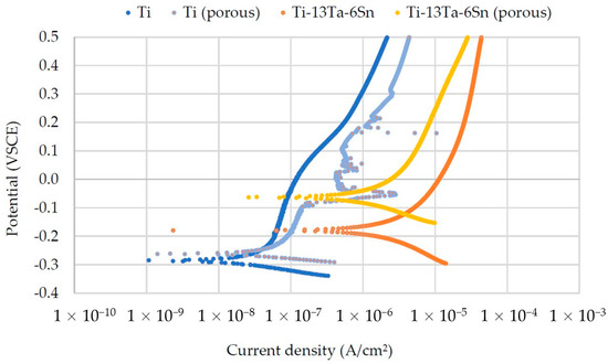 Table 5 lists the electrochemical properties of the samples. For all tested samples, the current density remained lower than 100 µA/cm2, a condition for spontaneous passivation [26]. Although the porous Ti-13Ta-6Sn alloy presented a superior passivity stability, as no breakdown potential, Ebreak, was reached with scans up to ~0.5VSCE, further investigations should be carried out to better understand the phenomenon.