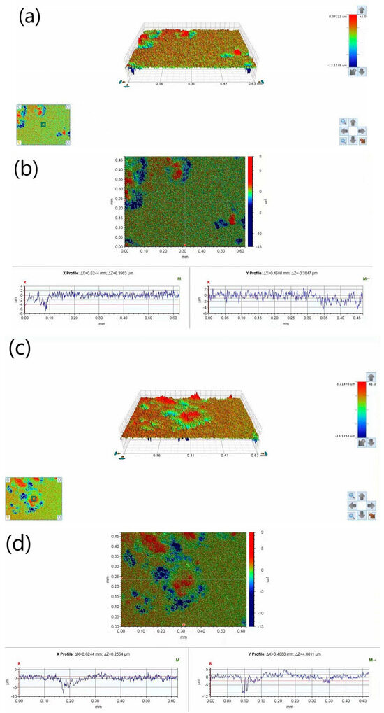 Surface profiles of the experimental samples: (a,b) show the surface profile of sample 1; (c,d) show the surface profile of sample 2.