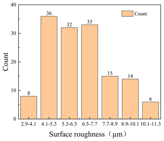 The printing parameters of the experimental samples were set in Table 2. After printing, the surface roughness values of all samples were measured and organized into a histogram (Figure 5). From the histogram, it can be seen that the surface roughness values ranged from 2.90 µm to 11.30 µm. Most of the samples had surface roughness values clustered between 4.10 µm and 7.70 µm. We set the lower limit at 2.9 μm and the upper limit at 11.3 μm, dividing the range into seven equal intervals, each with a width of 1.2 μm. The printing parameters of the five best samples are organized in Table 3, and the rest of the data are included in Appendix A.