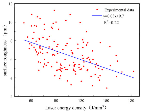 To further compare the relationship between surface roughness and laser energy density, the corresponding laser energy density and surface roughness of all 144 samples were counted and prepared as a scatter plot (Figure 6). The R2 for this linear fit is 0.22. It can be seen from the figure that the laser energy density is indeed inversely proportional to the surface roughness as a whole, and the higher the laser energy density, the lower the surface roughness of the sample. The relationship between them is weakly and inversely correlated. However, the relationship between laser energy density and surface roughness is very complex, so this part is only a simple reasoning of the relationship between the two. The relationship between process parameters, laser energy density, and surface roughness also needs to be inferred from the ML prediction results.