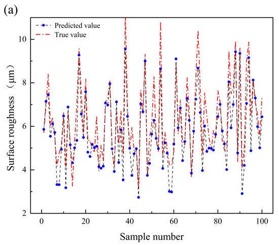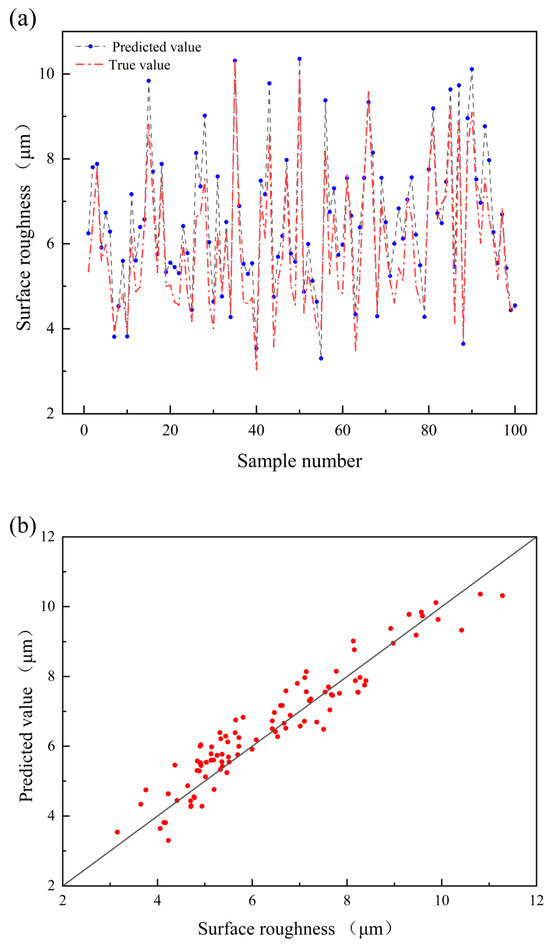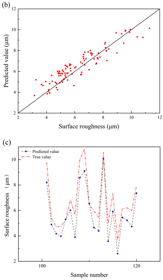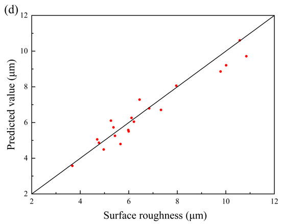 Meanwhile, from the corresponding linear fitting, some data distribution is relatively discrete. This is most likely because of uncontrollable factors during the printing process. For example, the airflow field can impact the roughness of the printed parts [30]. The printer’s blower device can blow up fine spray powder during printing, which may splash onto other nearby sample surfaces, affecting surface forming and roughness. The surface roughness of individual samples fluctuates within a range of 1–2 μm, making predictions challenging when the surface roughness is excessively low. This leads to training data that is noisy, which affects the prediction results of the model [31]. To reduce errors in the regression prediction and improve the accuracy of the machine learning model, data that are too discrete are removed, and the remaining data are used as a database for the following ML regression.